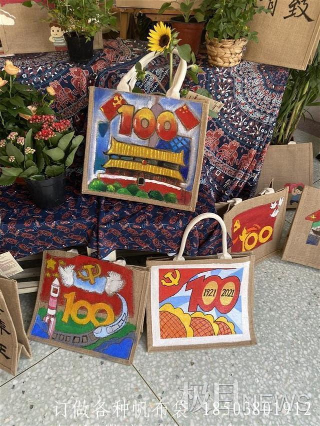 在教学楼楼梯口,极目新闻记者看到,一百三十余个手绘帆布袋陈列在展示台上,每名教师根据自己的喜好进行挑选。“这些帆布袋由学校美术和书法校队的学生手绘而成,还有一部分是学生在课后托管的兴趣班上完成的。”学校美术老师潘瑜介绍,手绘帆布袋的主题为庆祝建党100周年,学生发挥自己的想象力设计草图,再用丙烯颜料在帆布袋上绘制。