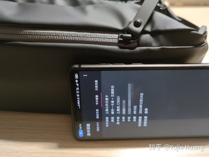 众所周知,不是所有城市的公交都支持刷手机享受本地优惠的,因此对于他们来说,拥有一个有公交卡存储空间的通勤胸包来 “刷包” 很有必要。我将一张公交卡放置于前仓,并用手机内的NFC读取软件试图读取卡模拟真实刷卡情况,结果显示隔开2cm时手机就已经感应到公交卡,刷卡体验良好。