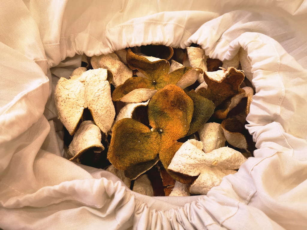 棉布袋材质天然,用来长时间储存陈皮,让人感到放心。布袋的透气性较好,但也带来一定的储存问题,储存低年份的陈皮容易受潮,也容易蛀虫,对环境条件要求高,一定要控湿,且保持室内通风干燥。可以选择比较厚实致密的布袋,透气性和密封性之间平衡较好,可以起到一个较好的温湿度的调节作用,是比较好的可以陈化陈皮的容器。