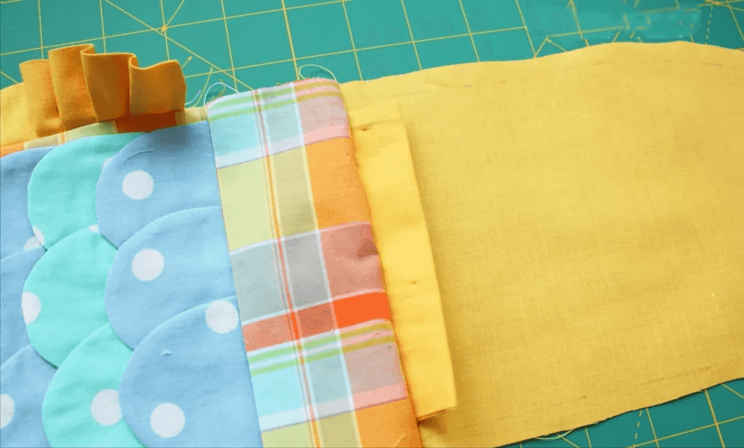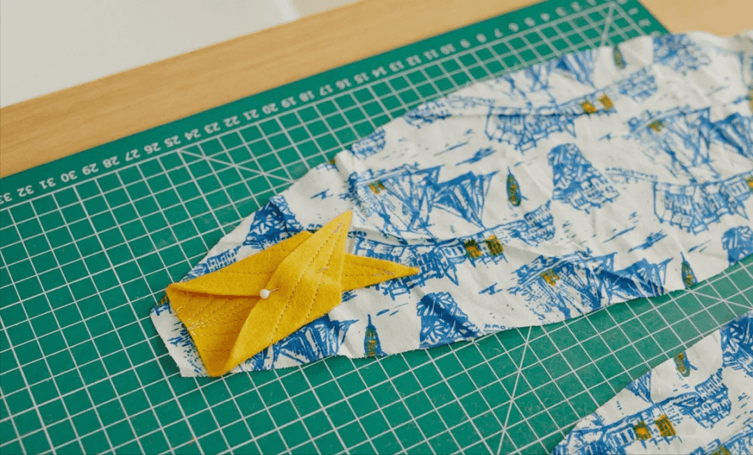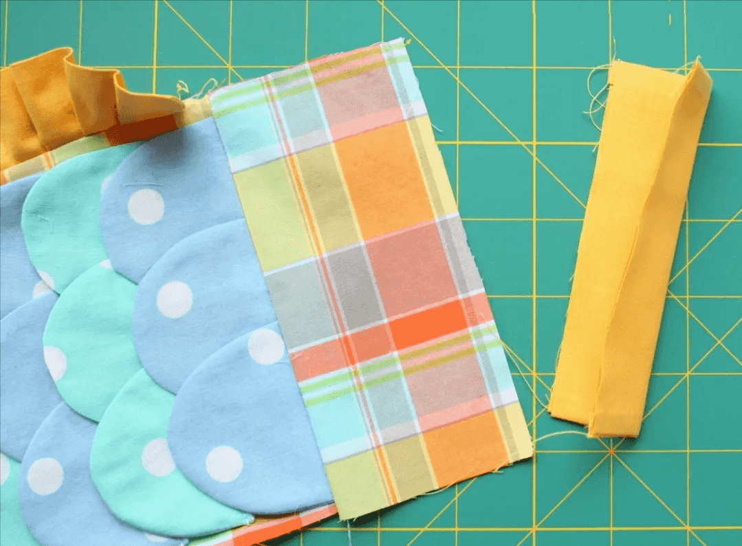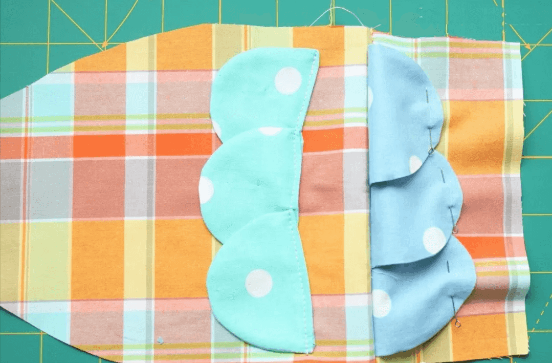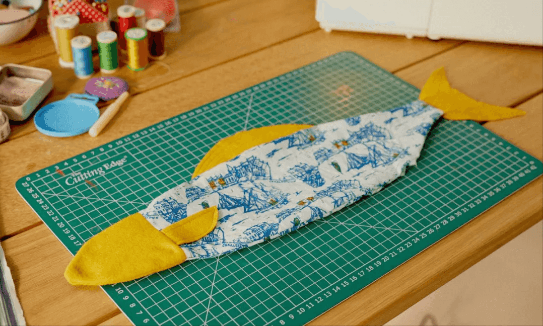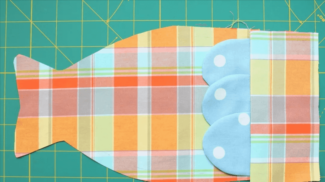 准备一块布做鱼的背鳍,对折好车缝,打褶车缝在鱼身上。