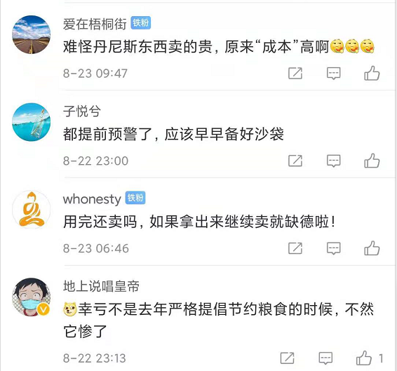 网友纷纷发表看法:“难怪丹尼斯东西卖得贵,原来‘成本’高啊!”“都提前预警了,应该早早备好沙袋。”“用完还卖吗?如果拿出来继续卖就缺德啦!”“幸亏不是去年严格提倡节约粮食的时候,不然它惨了!”