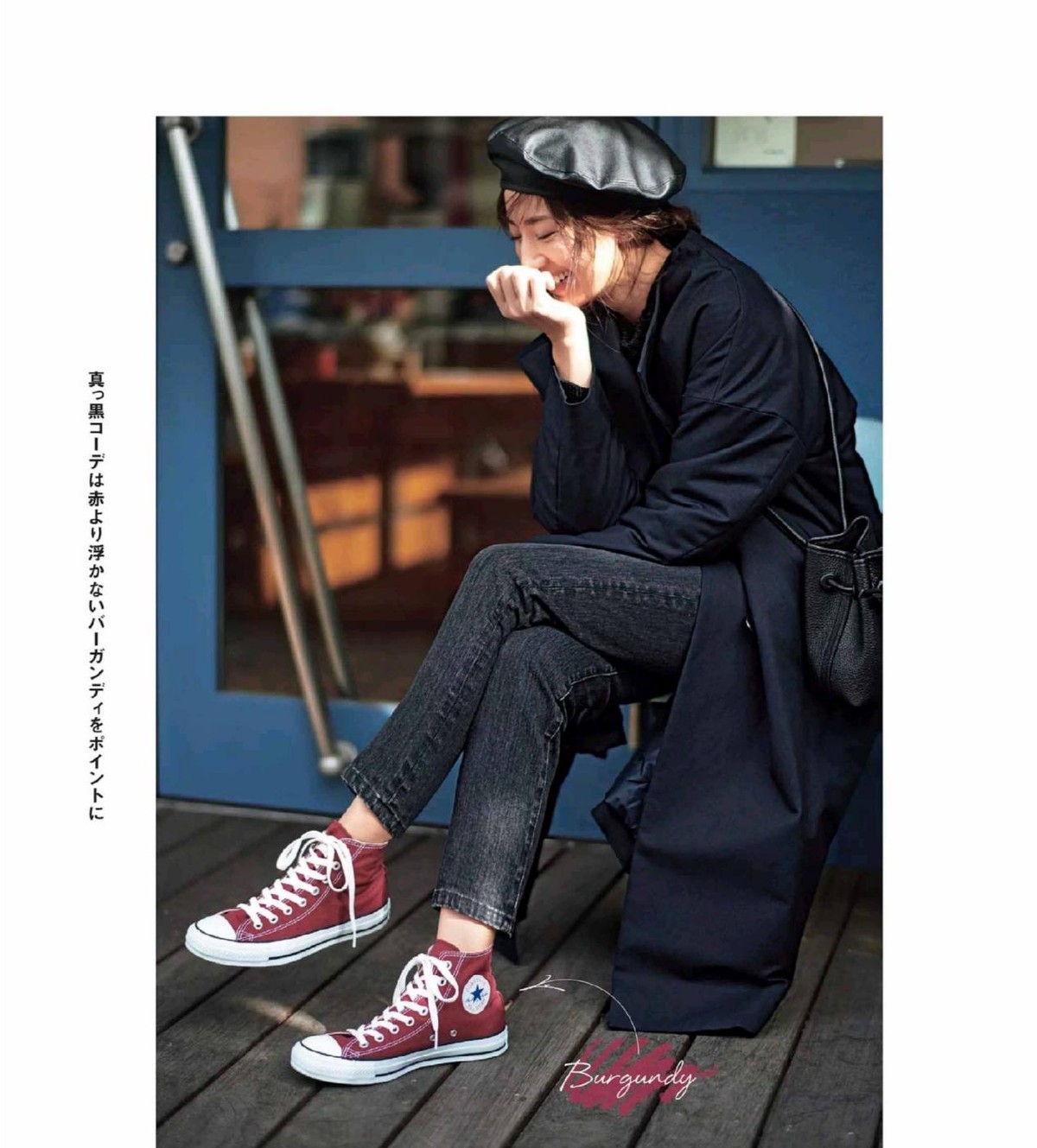 在这么多的帆布鞋的色彩之中,不要只是局限在白色这一种之内,因为它挑战起来没有过多的难度,穿起来也不够显眼。如果想要提升一下亮眼的效果,可以打造出明暗配色的作用,利用一款酒红色的帆布鞋,加入到穿搭之中,展现出一种活力的感觉和有点热情的氛围。