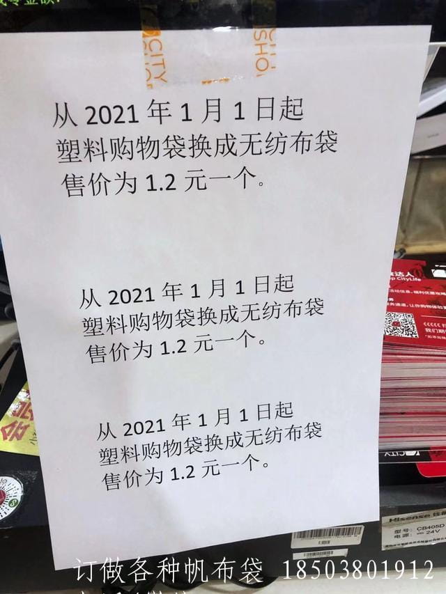 城市超市上海影城店的收银台上贴着这样一张告示:“从2021年1月1日起,塑料购物袋换成无纺布购物袋,售价为1.2元一个。”记者看到收银台上正放着一沓无纺布购物袋,规格相当于中等购物袋大小。