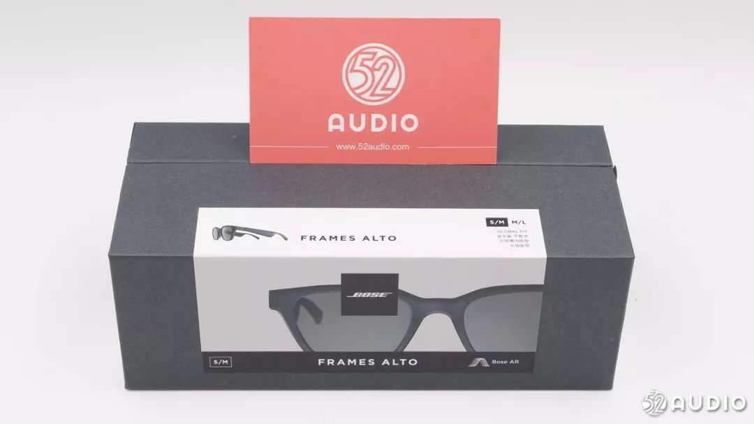 BOSE的这款智能音频眼镜叫做 FRAMES ALTO。在外部深灰色的包装盒上贴有一张较大的贴纸,这张贴纸类似宣传页面,从正面和侧面展示了FRAMES ALTO智能音频眼镜的外观细节。