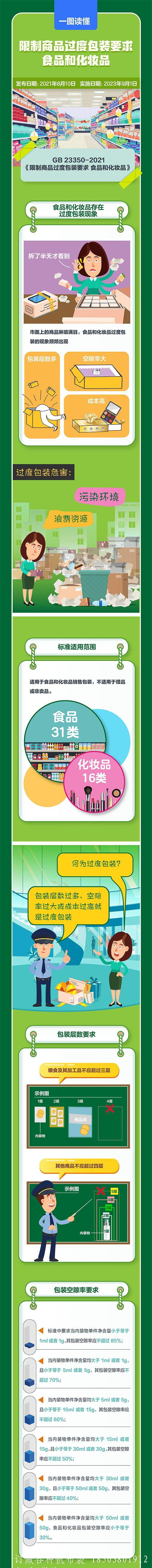 新标准明确,食品或化妆品内装物的体积是用净含量乘以必要空间系数来表示,必要空间系数的取值依据产品而定。标准也明确, 食品中的粮食及其加工品不应超过三层包装,其他食品和化妆品不应超过四层包装。