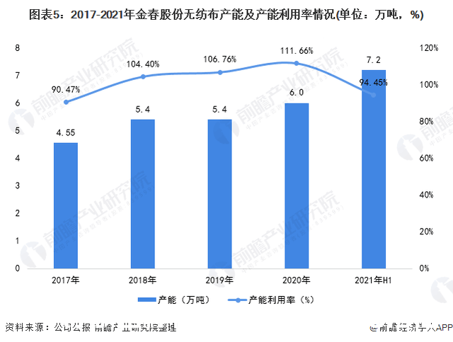 2017-2020年,金春股份无纺布产能呈现上升态势,从2017年的4.55万吨产能规模增长至2020年的6万吨,产能规模位列无纺布上市公司首位。2021年上半年,公司新增无纺布生产线,无纺布产能提升至7.2万吨。