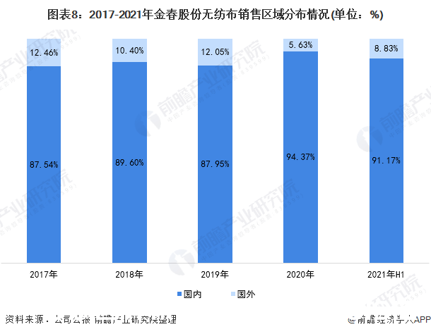 目前,公司客户遍布国内大部分省市,产品出口销往日本、韩国等国,并正在积极拓展欧美市场。根据公司年报显示,2017-2019年,公司无纺布主要在国内销售,部分销往国外。2020年疫情影响下,公司无纺布产品国内销售比重提高,无纺布出口占比仅为5.63%。