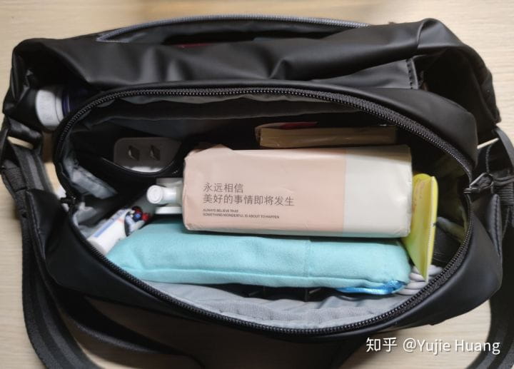 为了测试主仓区域的容量,故将移动电源*1、餐巾纸*1、蓝牙耳机*1、护手霜*1、便利贴*1、润唇膏*1、充电器*1、充电线*1、电流表*1放置在主仓内,并将一瓶水麻布袋电话/微信:15838231350放置在水壶区。毫无疑问,主仓轻轻松松hold住上述所有物品。