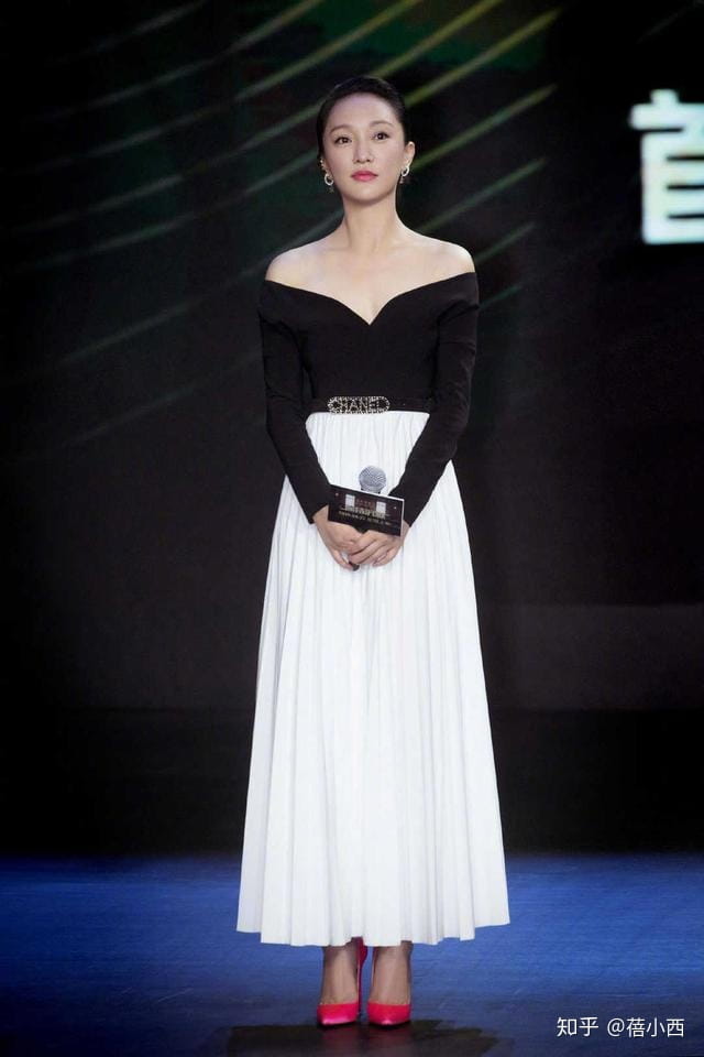 黑白结合可谓是非常经典的一对搭配组合,这一对色彩结合起来也能够凸显出亮点,让你看上去更加简单和大气,不经意间散发出迷人的魅力,周迅的气质出众,选择了黑色的露肩上衣搭配了白色长款半身裙,这一条半身裙结合了百褶的设计,更加飘逸和浪漫,而脚下的玫红色高跟鞋更是整个造型的亮点,能够不经意间凸显出时尚魅力。