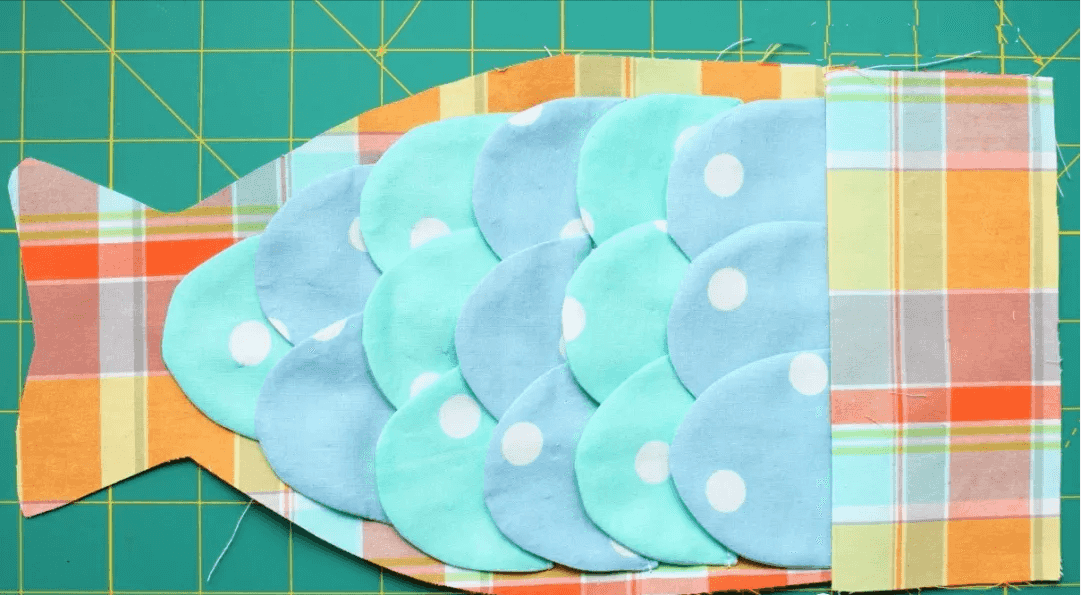 再剪4块布分开相叠,做鱼嘴,各自缝在鱼头上。