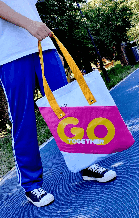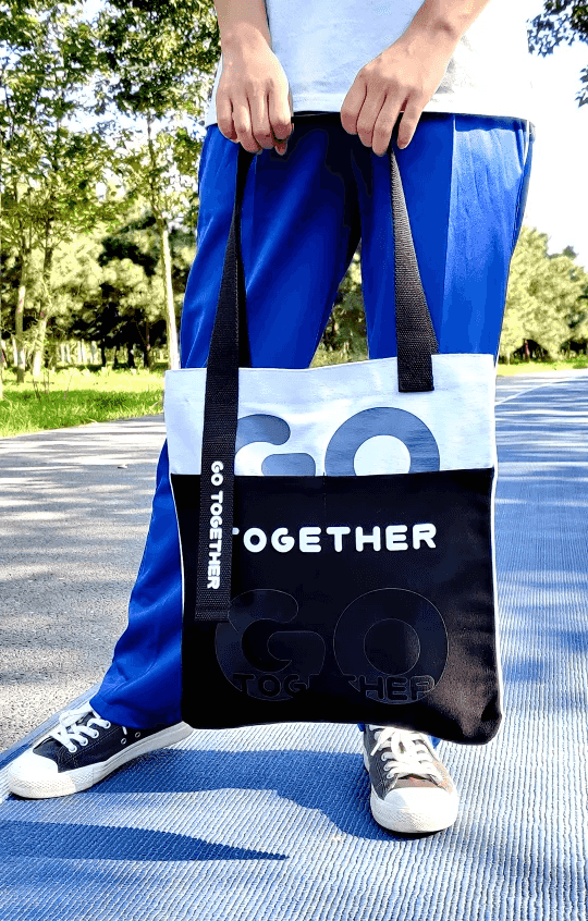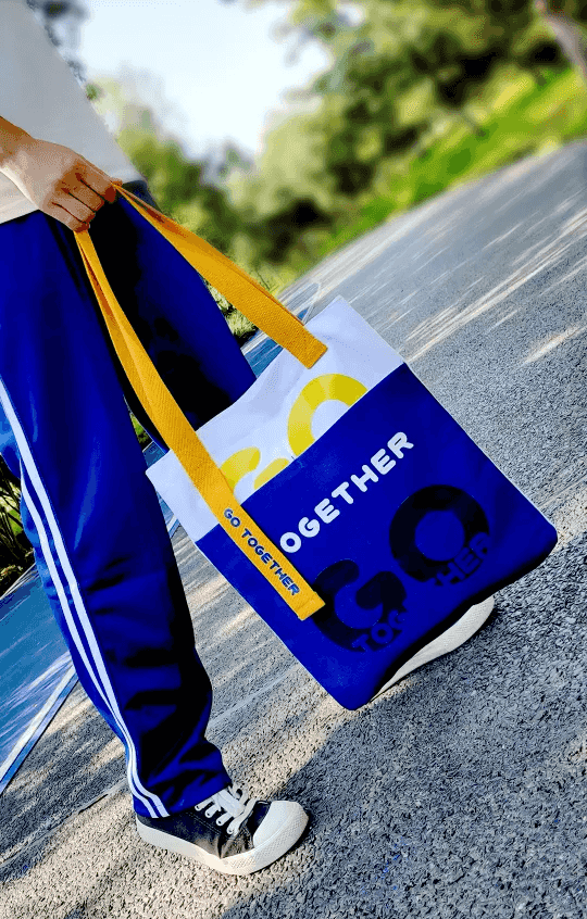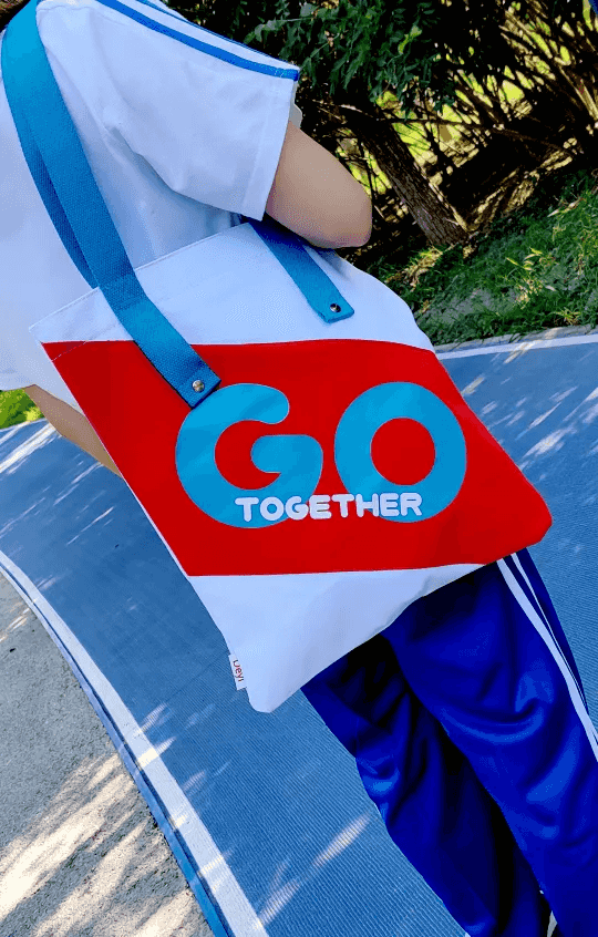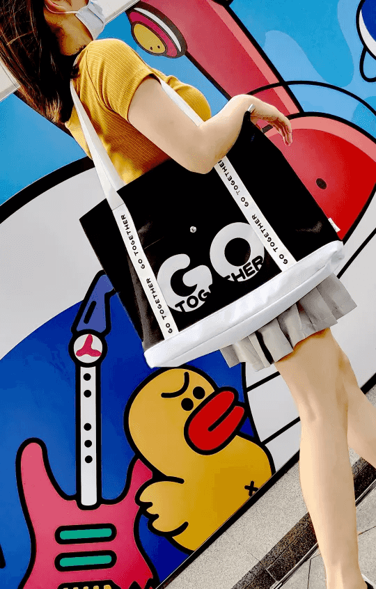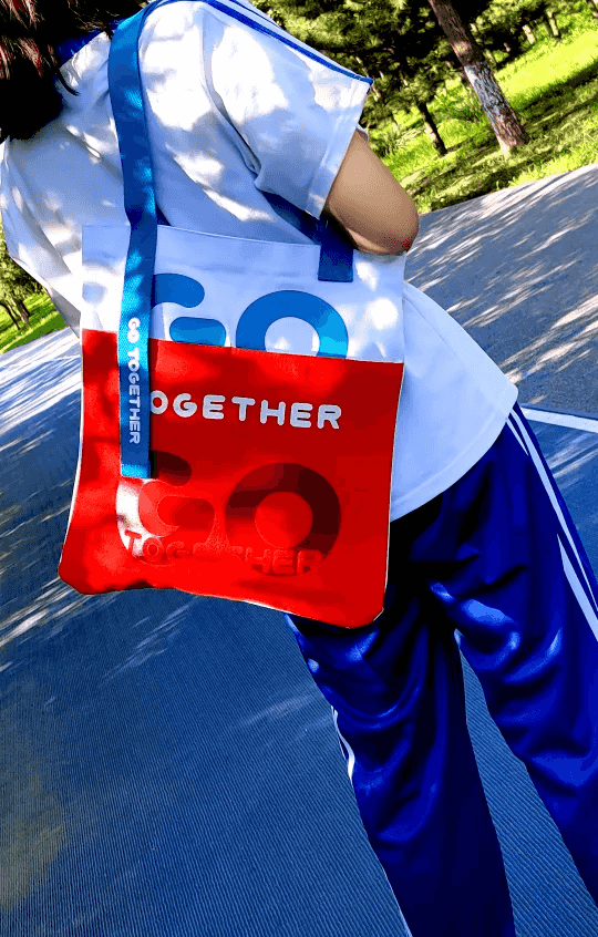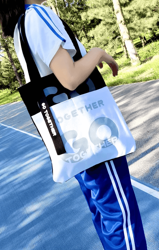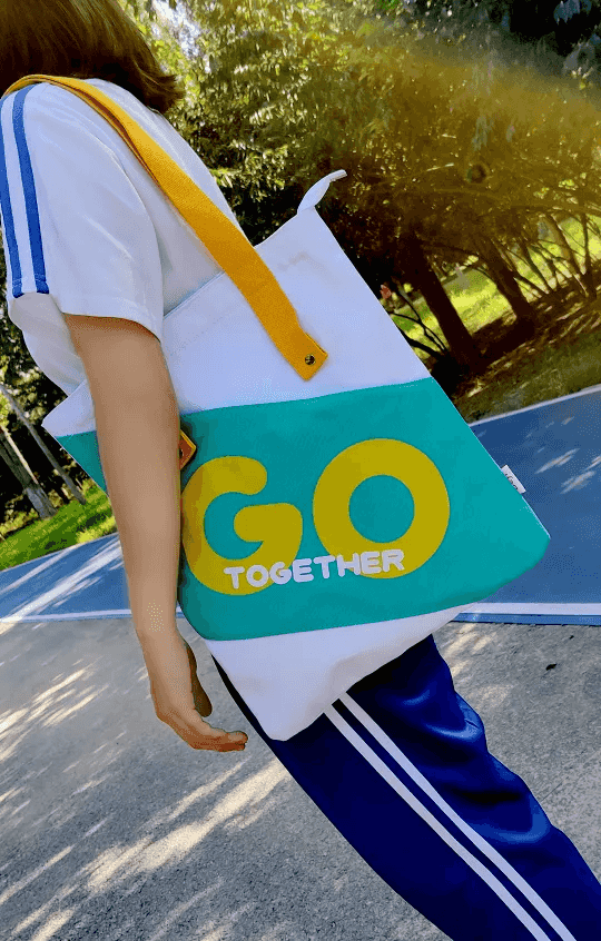 白色的帆布上一片多彩的帆布斜插而下,搭配GO together的英文装饰,不管是去逛街还是拍照,时刻彰显潮流前端人士的气场也不亏,你说呢?