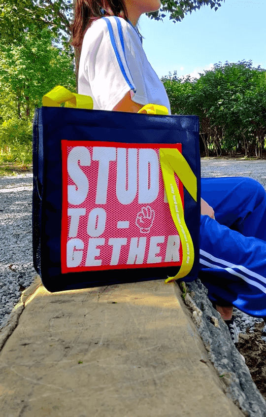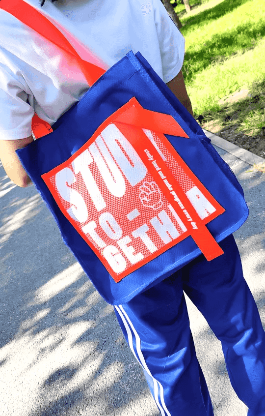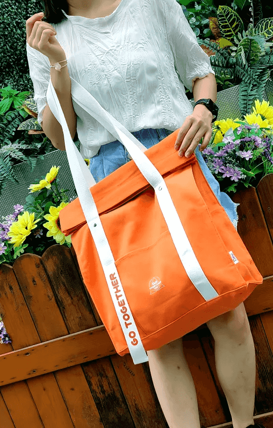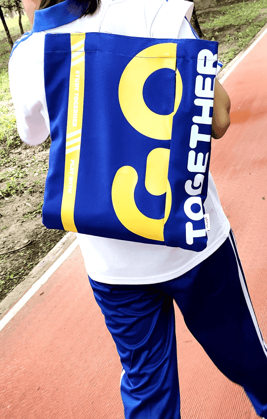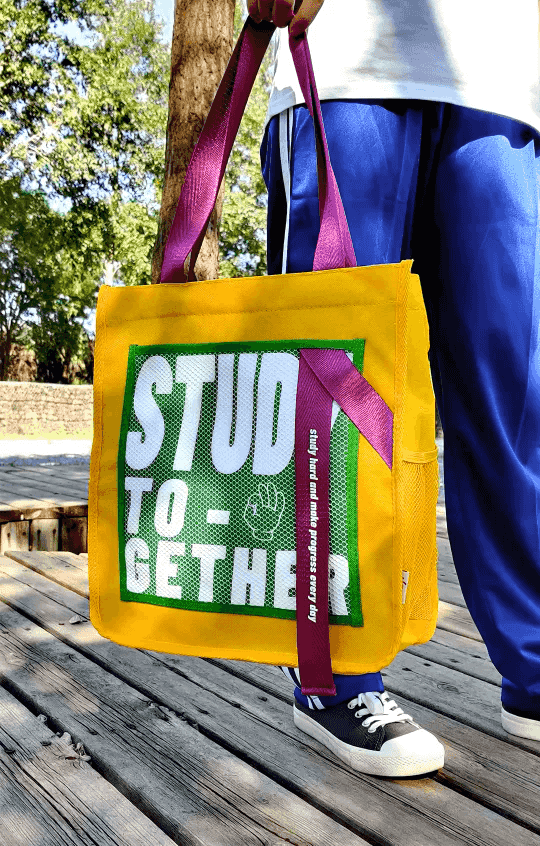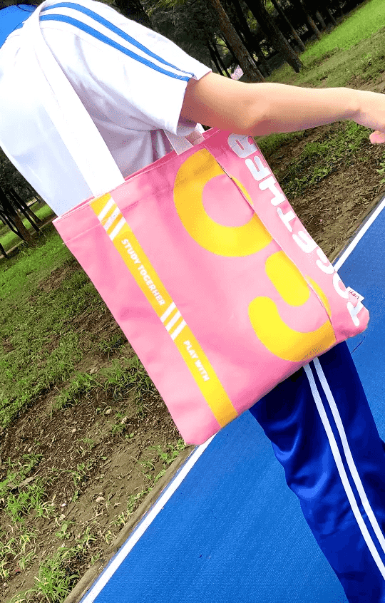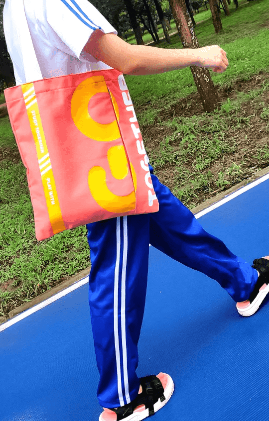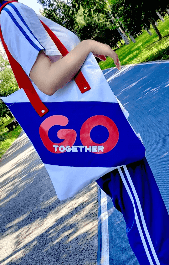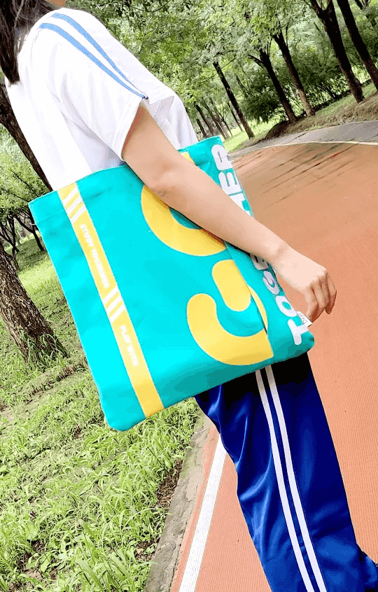 白色的帆布上一片多彩的帆布斜插而下,搭配GO together的英文装饰,不管是去逛街还是拍照,时刻彰显潮流前端人士的气场也不亏,你说呢?