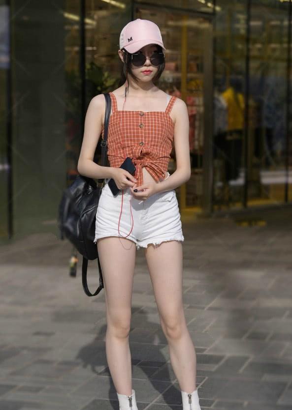 这个女生的上半身也是穿了一件露脐装的T恤,本身露脐装就很考验身材,而其实这种颜色本身并不是很显白,所以也就需要本身皮肤比较白的女生才能穿得好看了,同时配上一条短裤,也是一样很秀身材的。