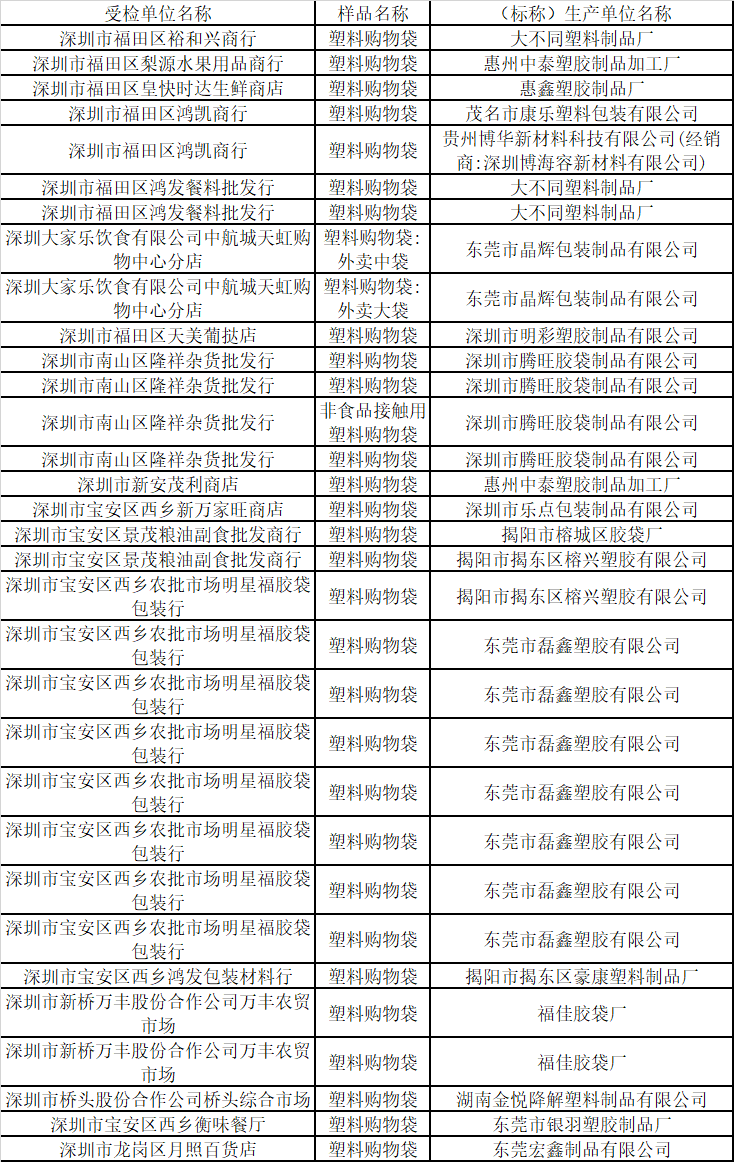 根据深圳市市场监督管理局的公布结果,存在问题的受检单位包括深圳大家乐饮食有限公司中航城天虹购物中心分店、深圳老锅底餐饮管理有限公司滇月梅林卓悦汇分店及深圳市环球酒店用品有限公司等单位,存在问题的生产单位包括东莞市晶辉包装制品有限公司、厦门鑫海诺包装材料有限公司、惠州市联诚塑胶制品有限公司等单位。