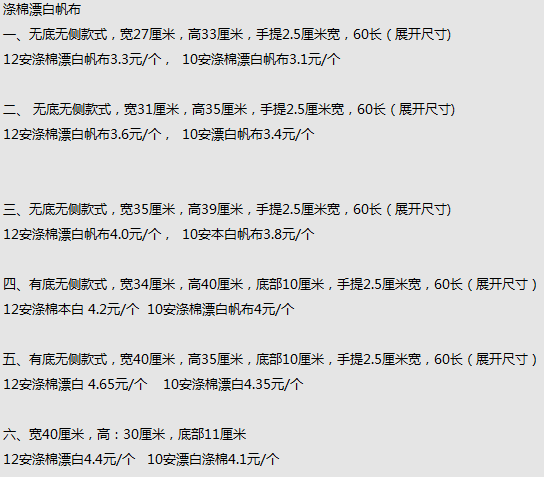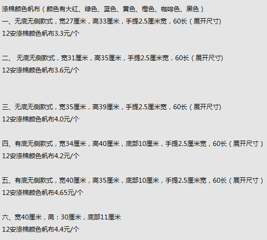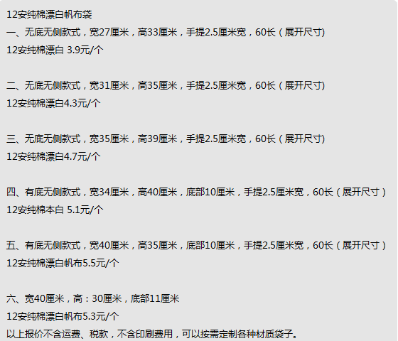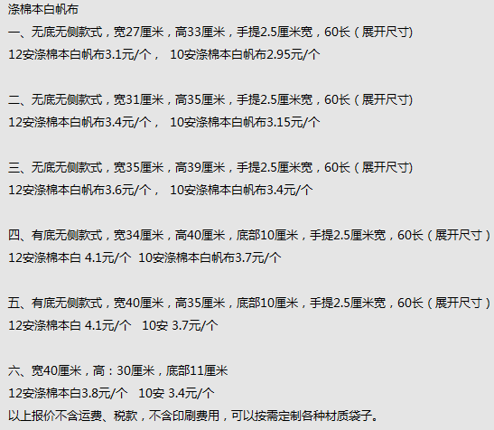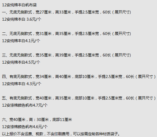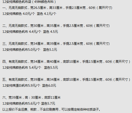 等到我们将颜色和材料选好之后,就可以选择帆布袋的规格,这就到了帆布袋的裁切工序。如果我们的顾客急于使用时,如金制袋厂将提供大量的现货规格。今天下单明天即可发货;需要定制的顾客可以将您需要的尺寸、数量、印刷内容发给我们。我们将有专业客服为您报价。以下是现货的价格,改价格即空白袋子的价格,不含印刷运费税等价格。