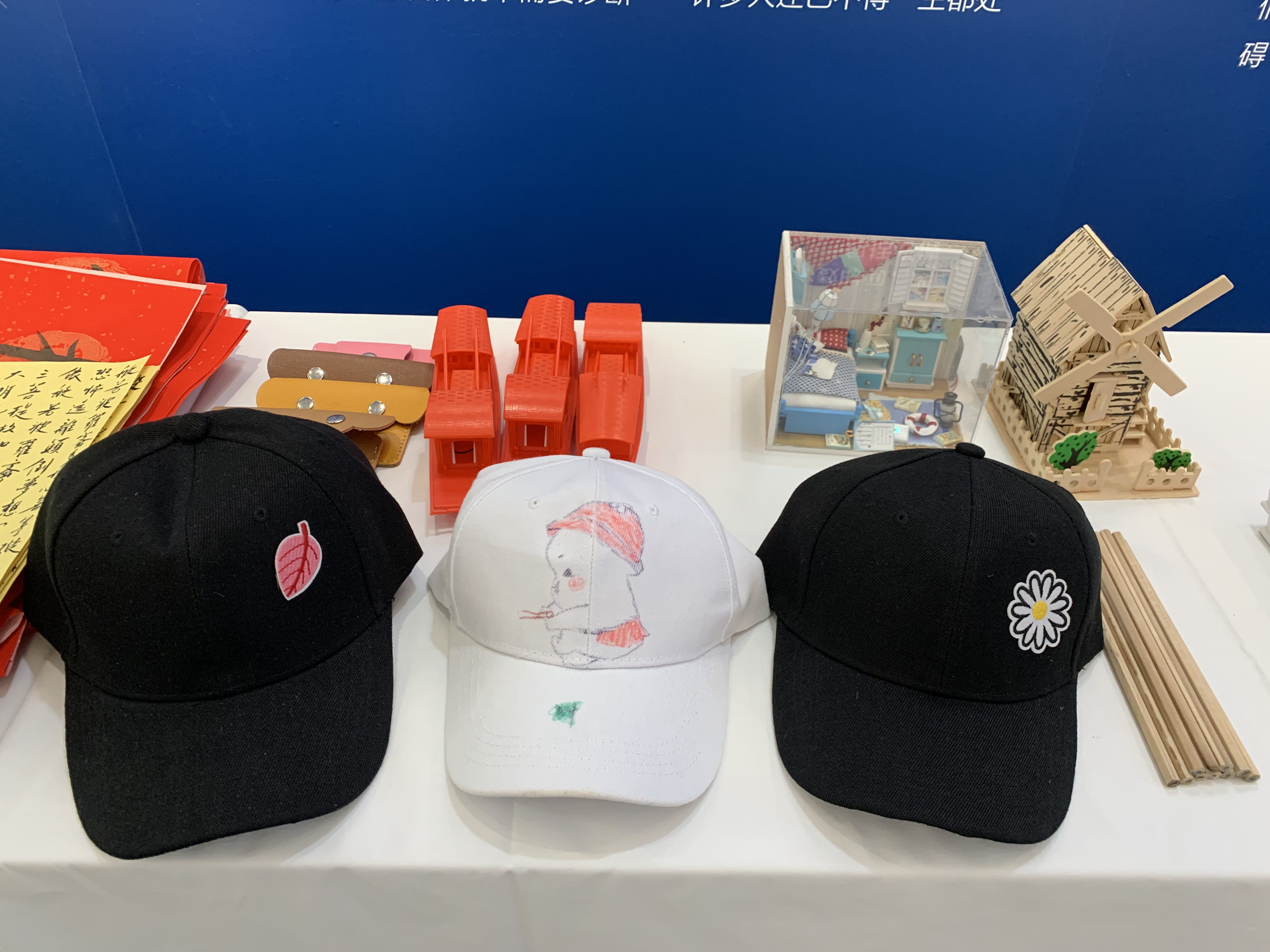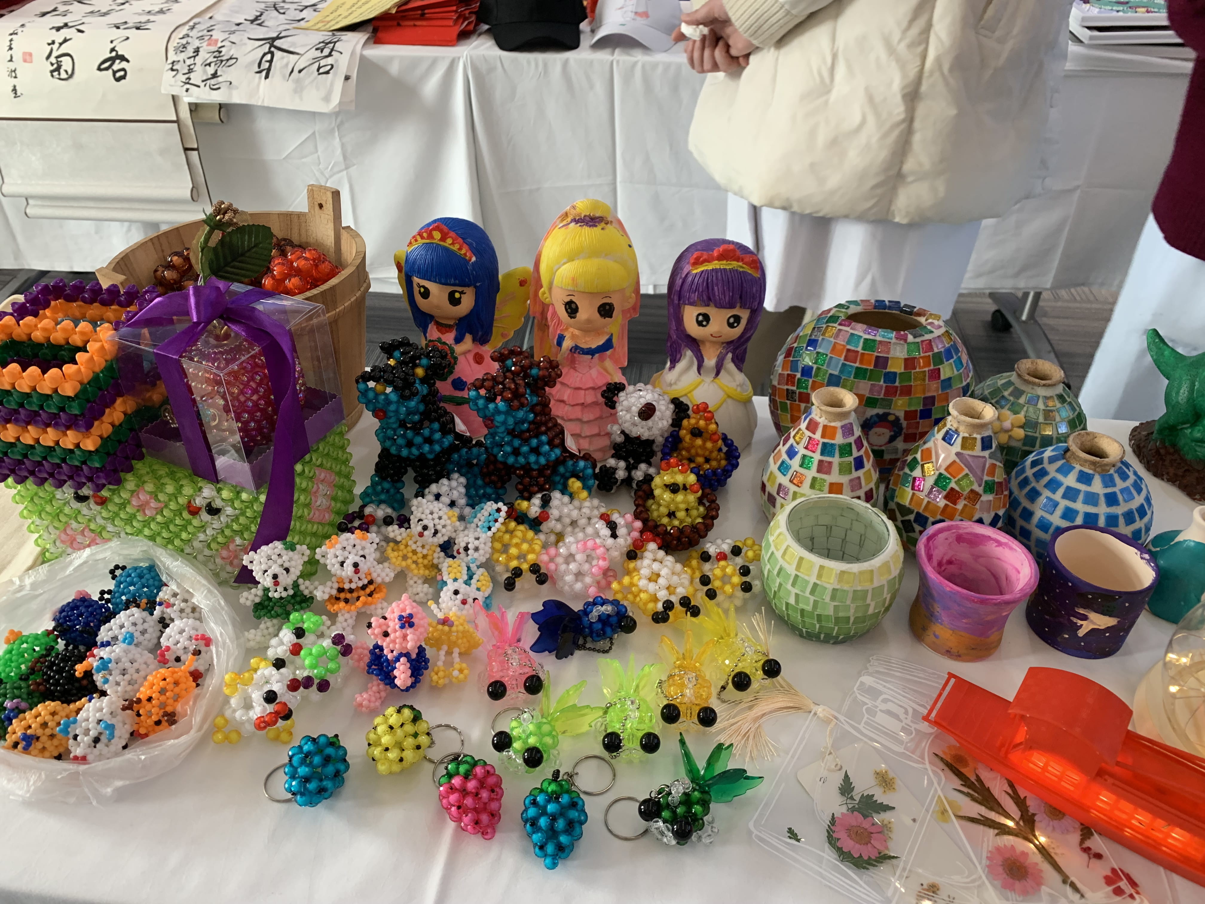 记者在现场看到,这些手作中不少为布袋艺术作品,上面画满可爱的卡通图案,还有用彩色珠子串成的小熊摆件、钥匙圈等,以及手工粘贴的马赛克花瓶、十字绣、笔筒等,价格多在20-50元不等。