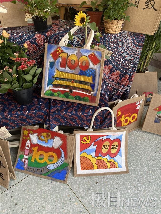 在教学楼楼梯口,极目新闻记者看到,一百三十余个手绘帆布袋陈列在展示台上,每名教师根据自己的喜好进行挑选。“这些帆布袋由学校美术和书法校队的学生手绘而成,还有一部分是学生在课后托管的兴趣班上完成的。”学校美术老师潘瑜介绍,手绘帆布袋的主题为庆祝建党100周年,学生发挥自己的想象力设计草图,再用丙烯颜料在帆布袋上绘制。