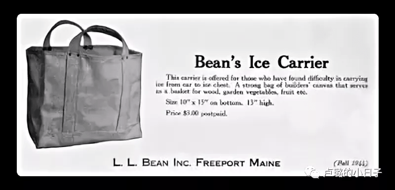 1944年,美国户外品牌L.L.Bean,设计出了一种盒子形状的袋子,用于运送冰块。不过后来这款包的多功能性很快被人们发现,L.L.Bean将这种包的设计加入了更加丰富时尚的元素,受到大众喜爱。