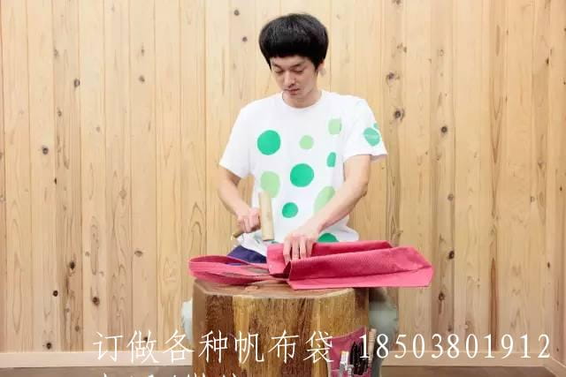 由于帆布厚且硬的特质,一泽家的帆布制品在裁剪之后和上缝纫机之前,会多出一个由木槌捶打成型的工序。