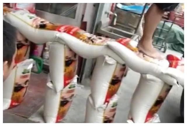 只见他先搬出一些米袋来,然后用这些米袋在货车和仓库中间搭了一座“桥”。然后当他运送米袋时,就直接在货车上用这座“桥”走向仓库,这样就省去了在货车上来回攀爬的时间。不过当男子运输了两三趟以后,当他再次搬着米袋上这座“桥”时,他脚下的米袋一下子轰然倒塌,差点把这个男子摔了一个大跟头。