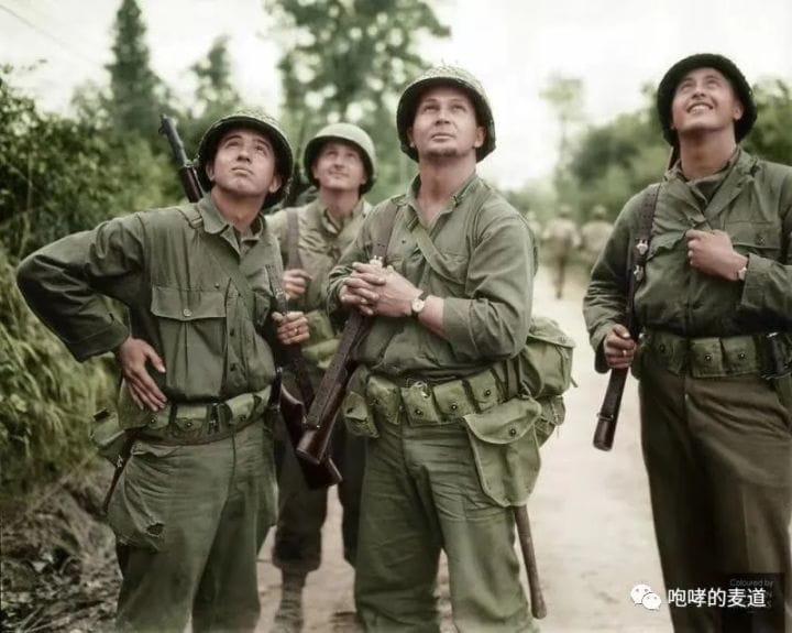 美军的帆布装具色调年代区分同样也适用于作战服体系上,我会单独写一篇文章讲美军野战制服色调,1944年是二战时期美军装备换装的大混乱时代,可以看到各种各样的颜色出现在同一名士兵身上,如下图。