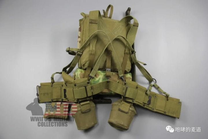 开战后也就是在1942年美军扩军后大规模的使用了OD-3色调,也就是浅卡其色,注意这个时期的装具颜色较一战装具颜色会偏浅一些。