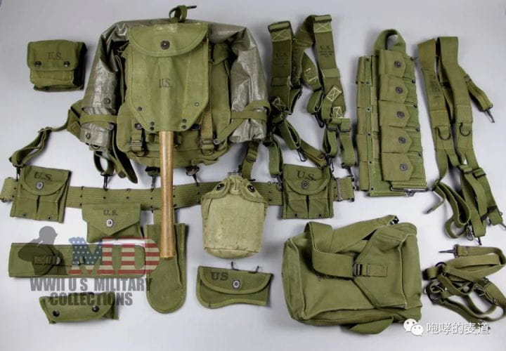 总体来讲二战时美军帆布类装备是传承于一战时期,在二战时期军方对于不同兵种开发了更多适用装备和通用装备,但是这些装备在大体上颜色都比较接近,那么我们从外观上如何区分呢,请看下图。