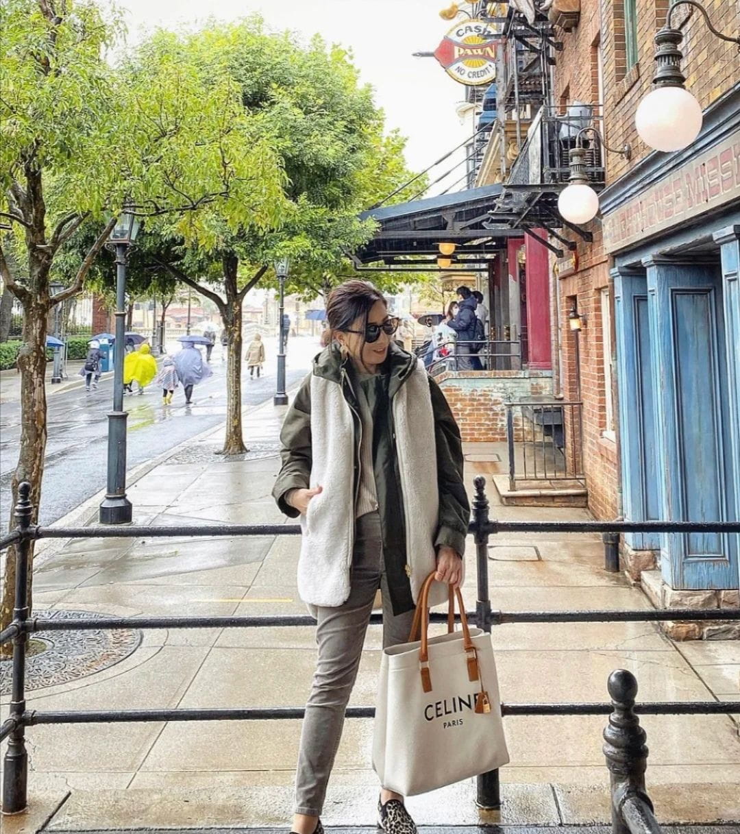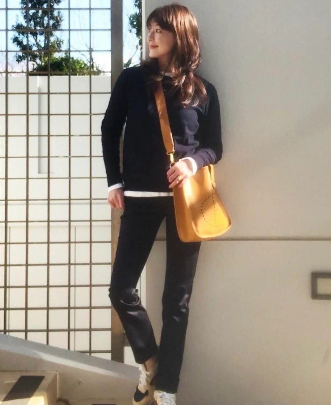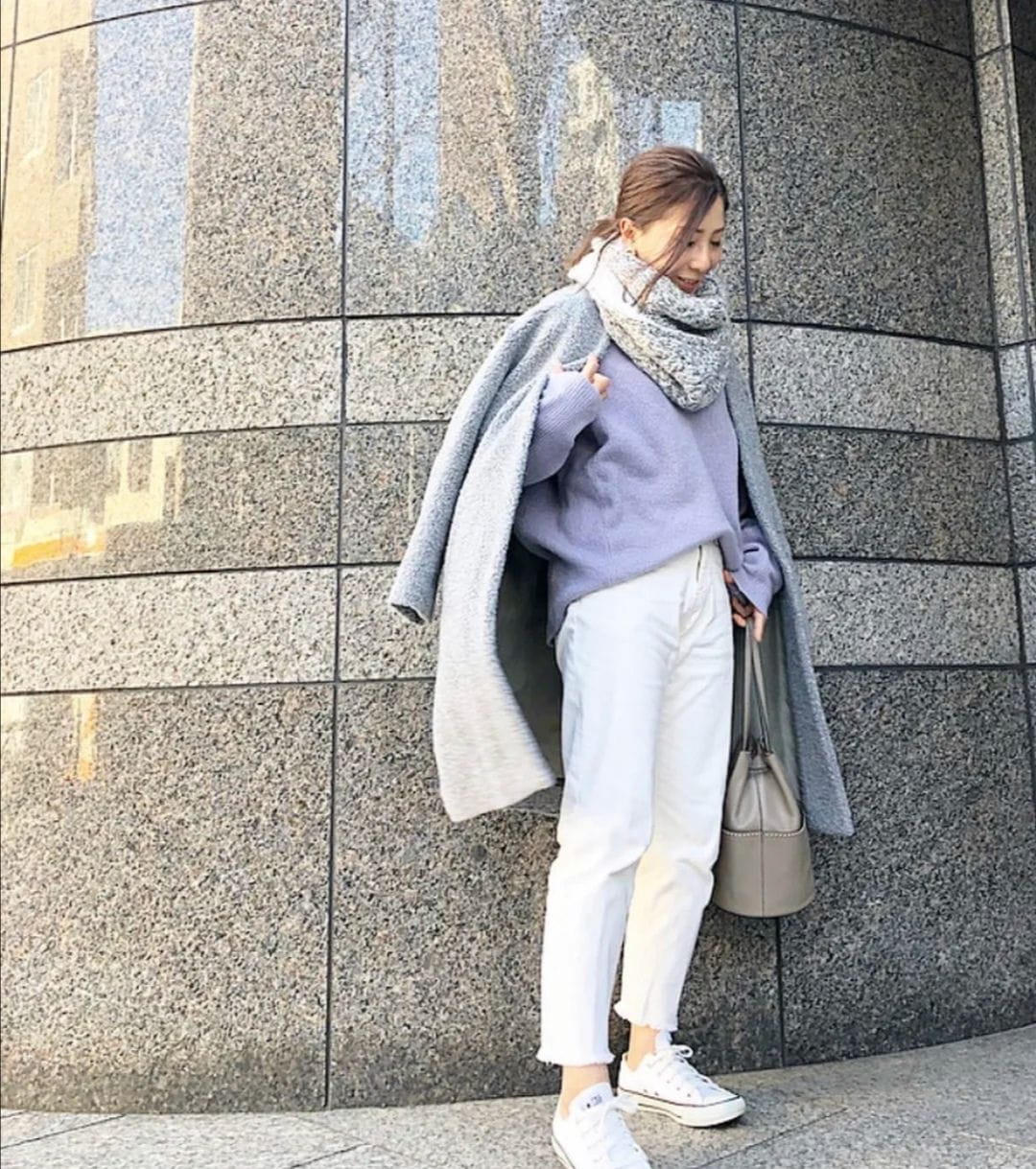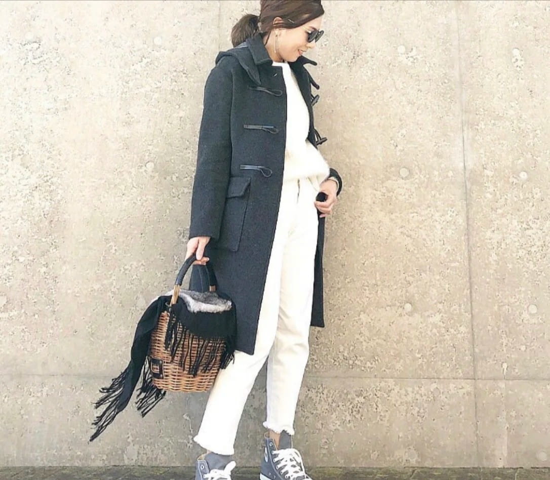长款大衣如果具备牛角扣的衔接,颜色又是深沉色系的填充,那么它将会收获不显老气的风格。加以帆布鞋的组合,则是为了让女性的年龄感进一步得到弱化和减轻。