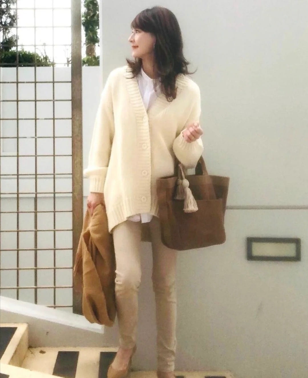 宽大一些的米黄色的大开衫,它在保暖效果的塑造上并不会太弱。结合披散下来的发型,让女子的温婉形象更为鲜活。