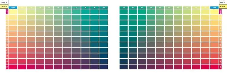 四色即:青(C)、品红(M)、黄(Y)、黑(K),所有颜色都可以通过这四种油墨混合而成,最终实现彩色图文。