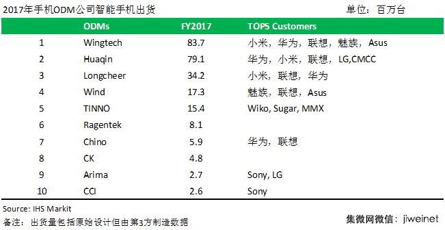 具体看,闻泰继续蝉联行业第一位置,出货量达到8370万部,前五大客户分为:小米、华为、联想、魅族、华硕。而华勤则稳居第二位,出货量为7910万部。前五大客户分为:华为、小米、联想、LG、中国移动。从出货量看,闻泰与华勤占据第一阵营。排名第三龙旗出货量达到34200,前三大客户分别为:小米、联想、华为。与德则以1730万的出货量排名第四,它的主要客户来自:魅族、联想、华硕。紧随其后,天珑出货量为1540万部。值得关注的是,其出货主要来自自家品牌Wiko、Sugar、MMX。排名6~10位出货量都没有超过1000万。第六名锐嘉科出货量810万、第七名Chino出货量为590万、第八名CK出货量为480万、第九名Arima出货量270万、第十名CCI出货量260万。
