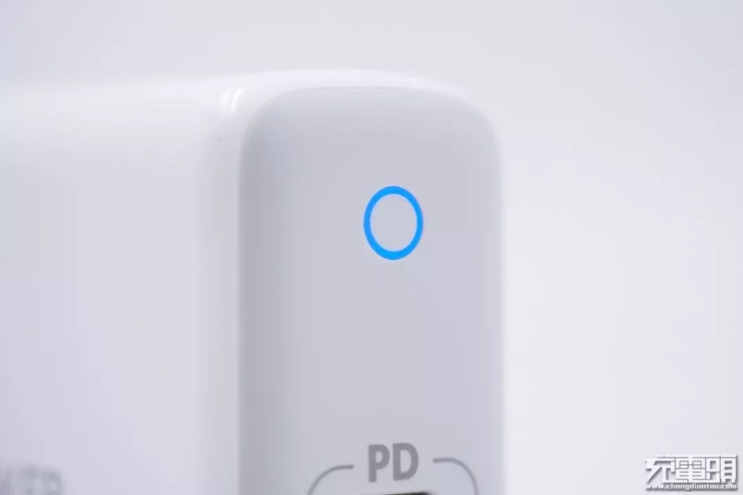 输出端面板为浅灰色,表面磨砂质感。ANKER 60W PD GaN 充电器共有2个USB-C接口,每个接口的胶舌均为安克蓝色,接口被一圈灰色圆环包围,上方有PD的标识。在输出面板上方部位有一颗环形电源指示灯。