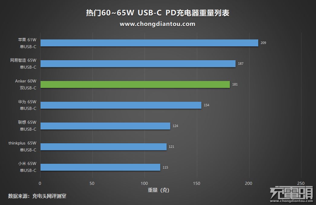 小编做了一张以前上手过的60W~65W充电器重量汇总,ANKER 60W PD GaN 双口充电器的重量在这些产品里面中规中矩,但是ANKER这款充电器可是双USB-C输出口,而其他则是单输出口。