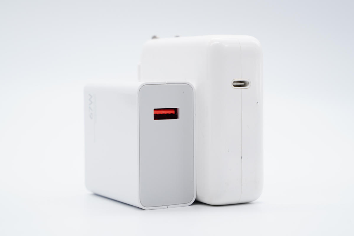 和苹果61W充电器大小直观对比,体积优势明显。