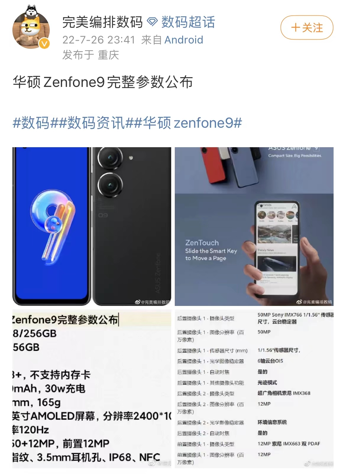 现如今,市面上的小屏手机少得可怜,对于钟爱小屏手机的用户来说,并没有什么选择的余地。不过,近日华硕即将在7月28日发布一款小屏旗舰Zenfone 9,今日也有博主曝光了华硕Zenfone 9的完整配置。