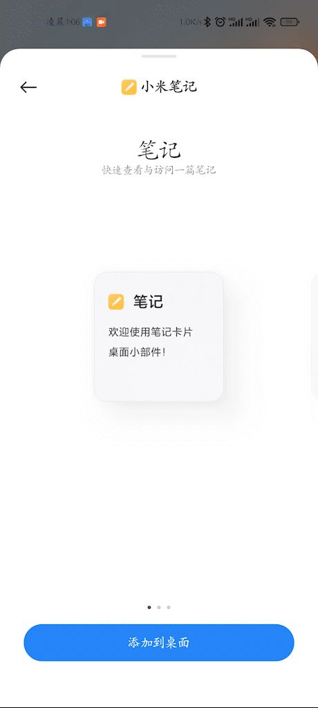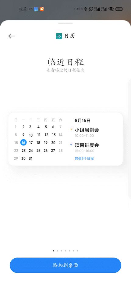 点击下方的“添加到桌面”,这一小部件就会以卡片的形式被添加到桌面,都是圆角化矩形块的设计,而且被添加到桌面还会有动画效果,就像下图这样。