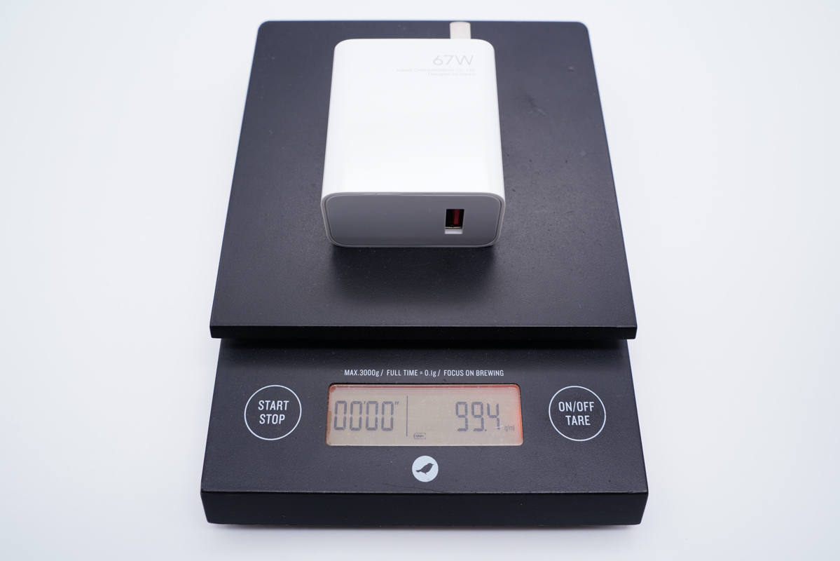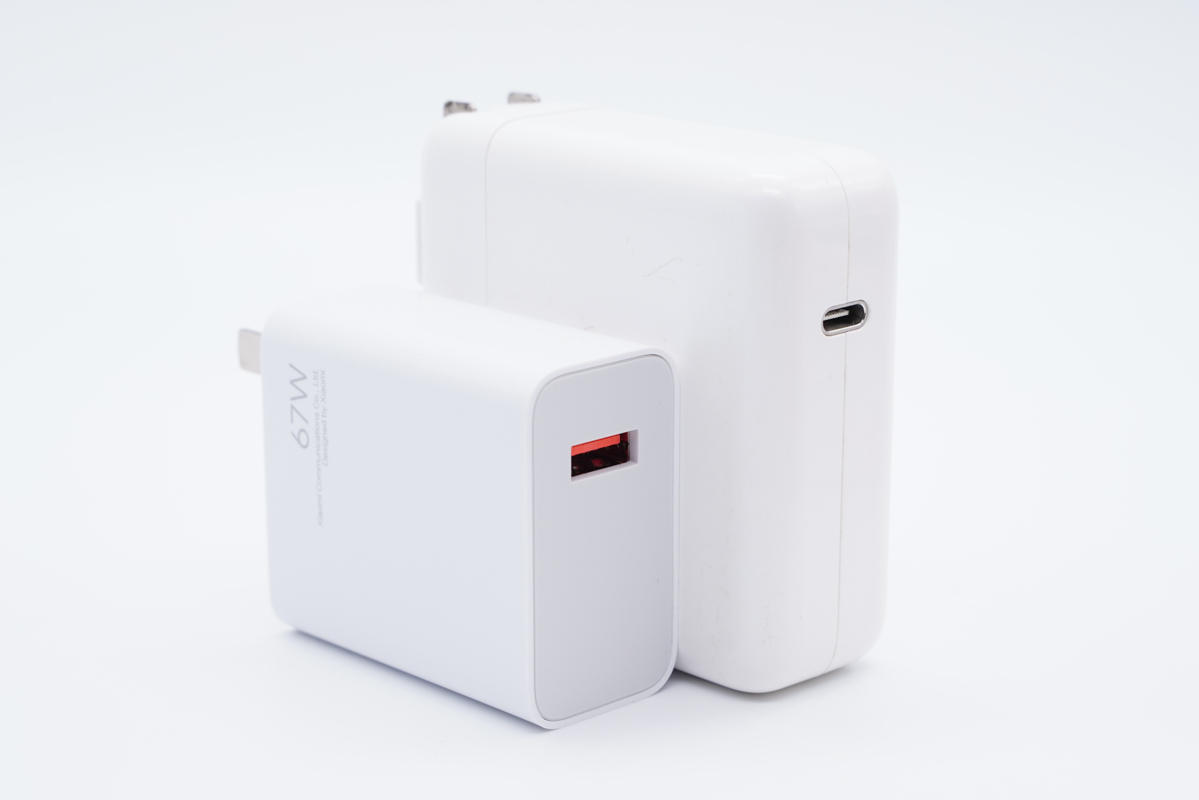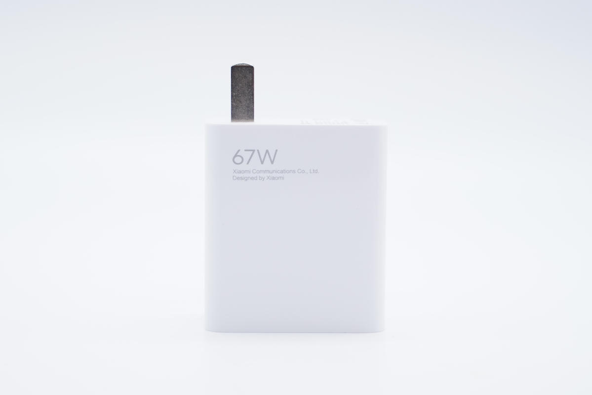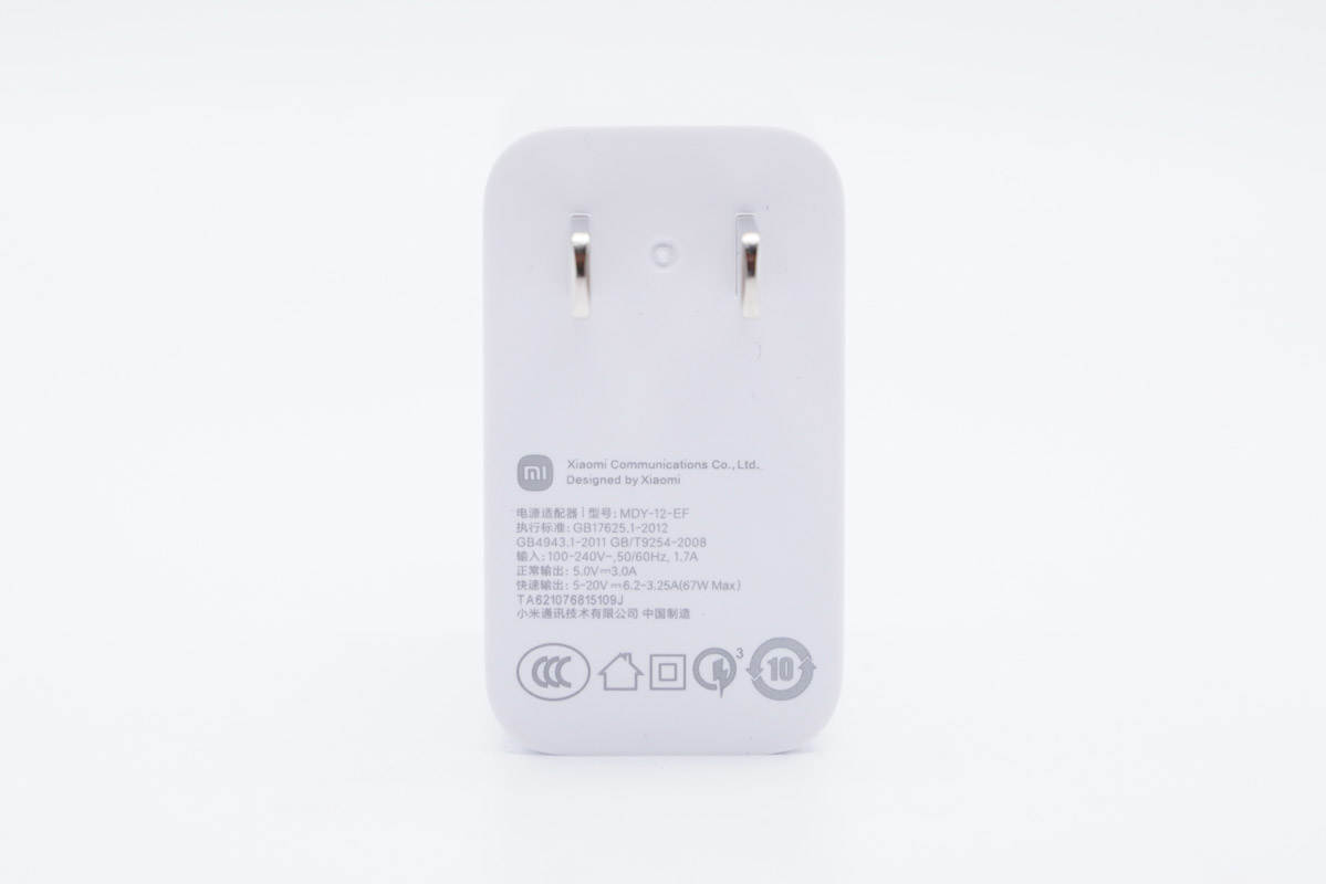 机身正背面均印有67W、Xiaomi Communications Co.,Ltd.以及Designed by Xiaomi字样。插脚固定式设计,靠一侧布局。