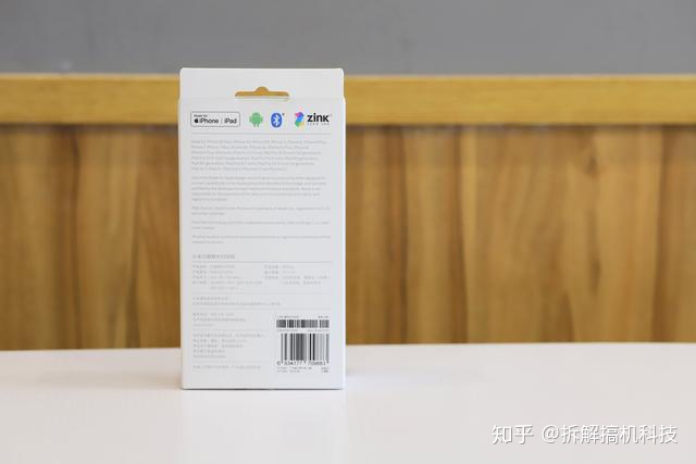 小米口袋照片打印机在包装上延续小米传统,白色简约风格,正面可看到是小米口袋照片打印机二维图,左上是可连接米家APP的标识,右上是小米的logo,左下是产品名称以及三英寸背胶照片、趣玩打印机,这就整合成所看到的包装盒正面图。背部同时中英文,这款产品是会流向国际的,所以会带有中英文,可连接苹果和安卓手机,最普通的一个参数详情。