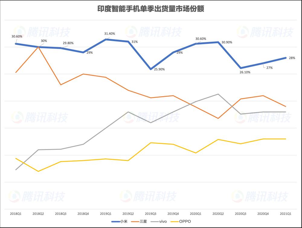 小米智能手机市场份额的稳步提升,欧洲市场贡献颇多,而另外一个海外市场也不容忽视,那就是如今饱受疫情困扰的印度。