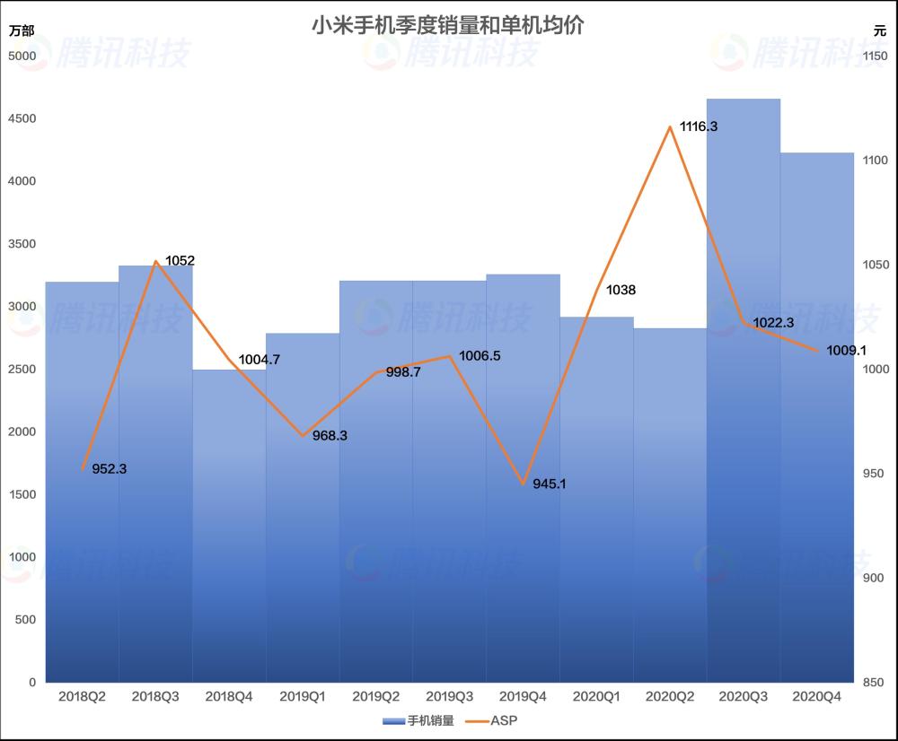 小米的财报中关于手机单价的披露信息中,小米从2018年Q2到2020年Q4的整机均价只上涨了50元左右,而ASP依然维持在1000元左右的区间。这意味着小米智能手机在过去几年尽管一直想要发力高端市场,但出货量大的主力机型,依然是中低端产品。