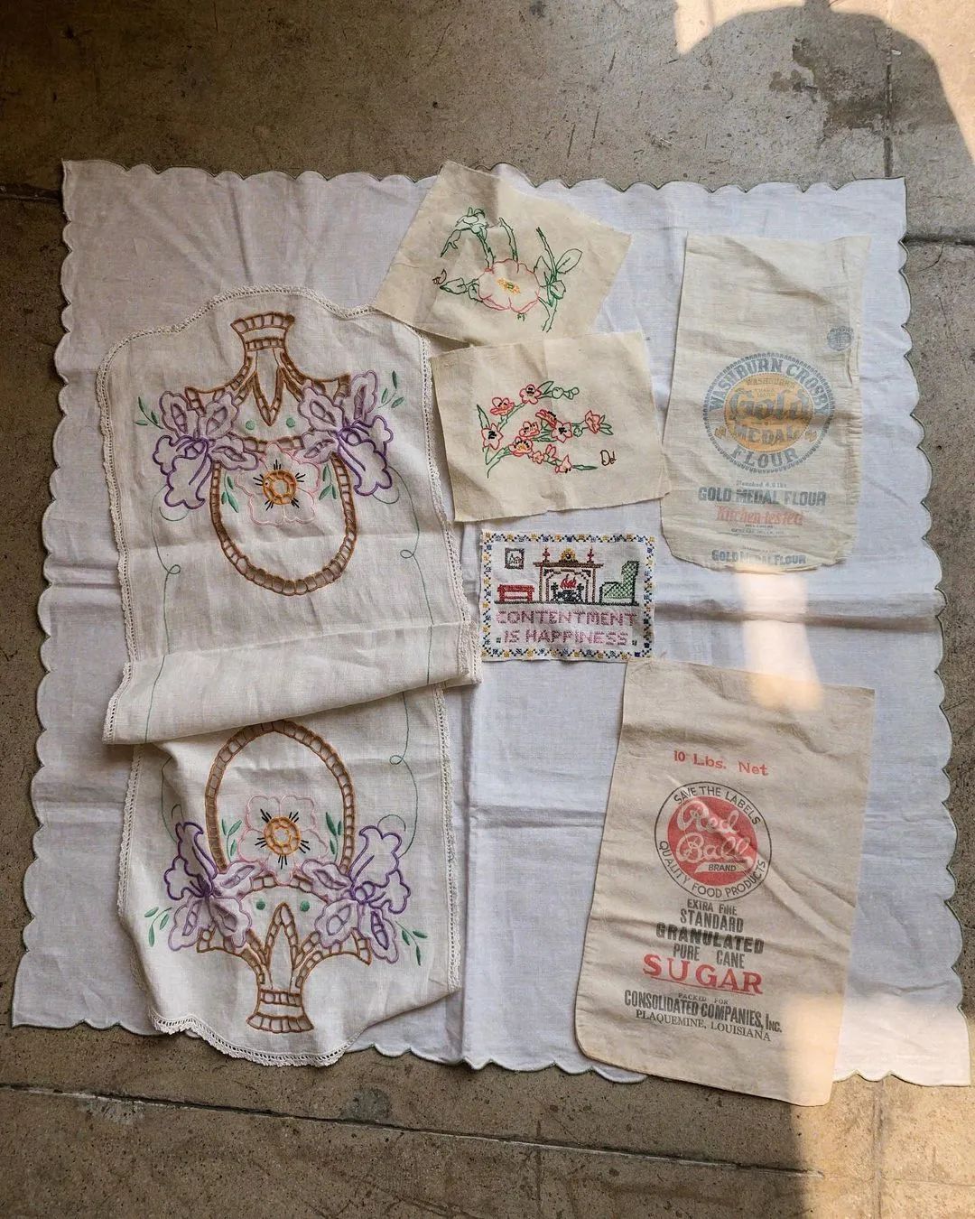 除了以前的桌布、刺绣旧织物等,竟然还有老式米袋、面粉袋和饲料袋。