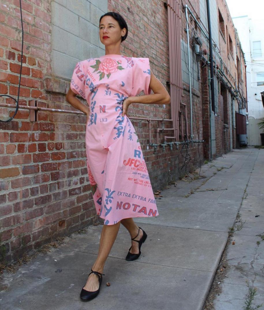 后来,用老式米袋或面粉袋再造的服装受到了顾客的欢迎,于是Crystal将店铺经营的重点,从销售复古服装扩展到了设计制作可持续服装。
