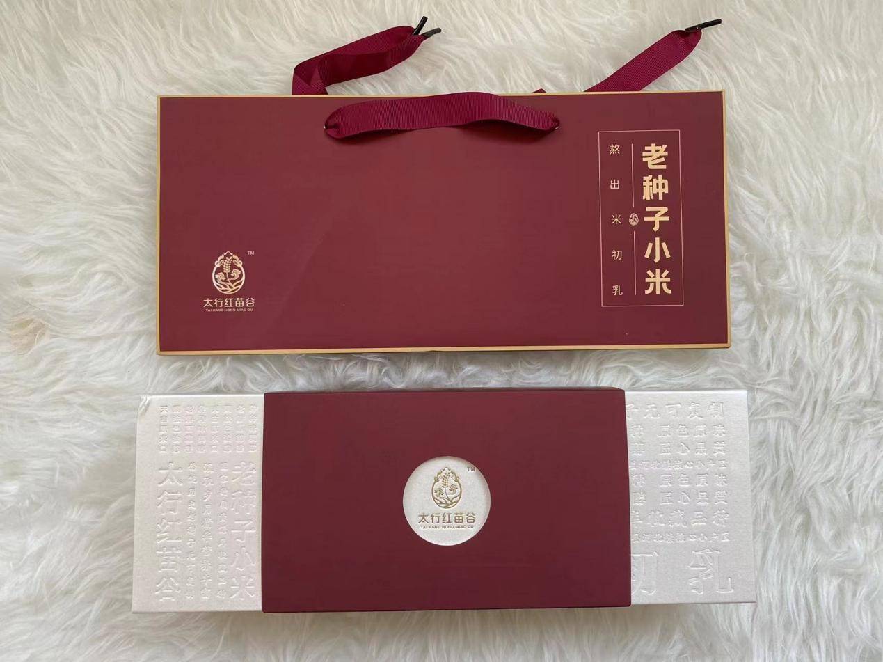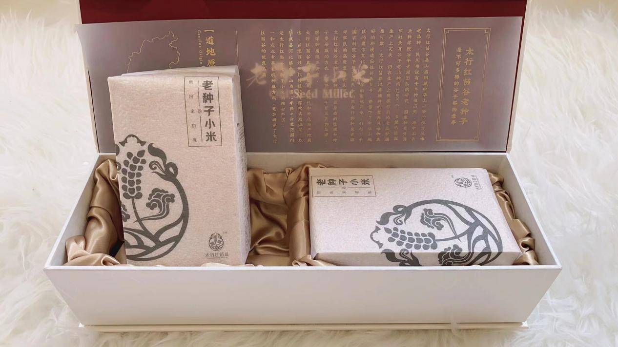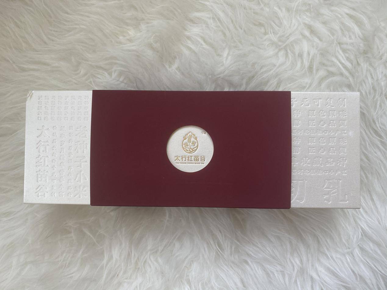 太行红苗谷小米外配一个勃艮第红手提袋,里面是白色礼盒和腰封,露出太行红苗谷金色的logo,打开盒子在香槟色内衬下紧实包裹着两块小米方砖,每个含量500g,同时还有一张太行红苗谷小米的详细介绍,此礼盒官方旗舰店售价为158元。从包装的设计到质感来说,太行红苗谷小米将历史文化与现代流行元素相结合,营造出一种别具特色的高级感,它充分利用空间,既小巧精致又不过度包装,满足年轻人送礼需求,有面子也有里子。