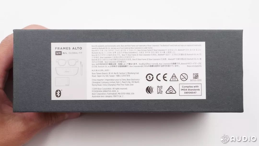 BOSE的这款智能音频眼镜叫做 FRAMES ALTO。在外部深灰色的包装盒上贴有一张较大的贴纸,这张贴纸类似宣传页面,从正面和侧面展示了FRAMES ALTO智能音频眼镜的外观细节。