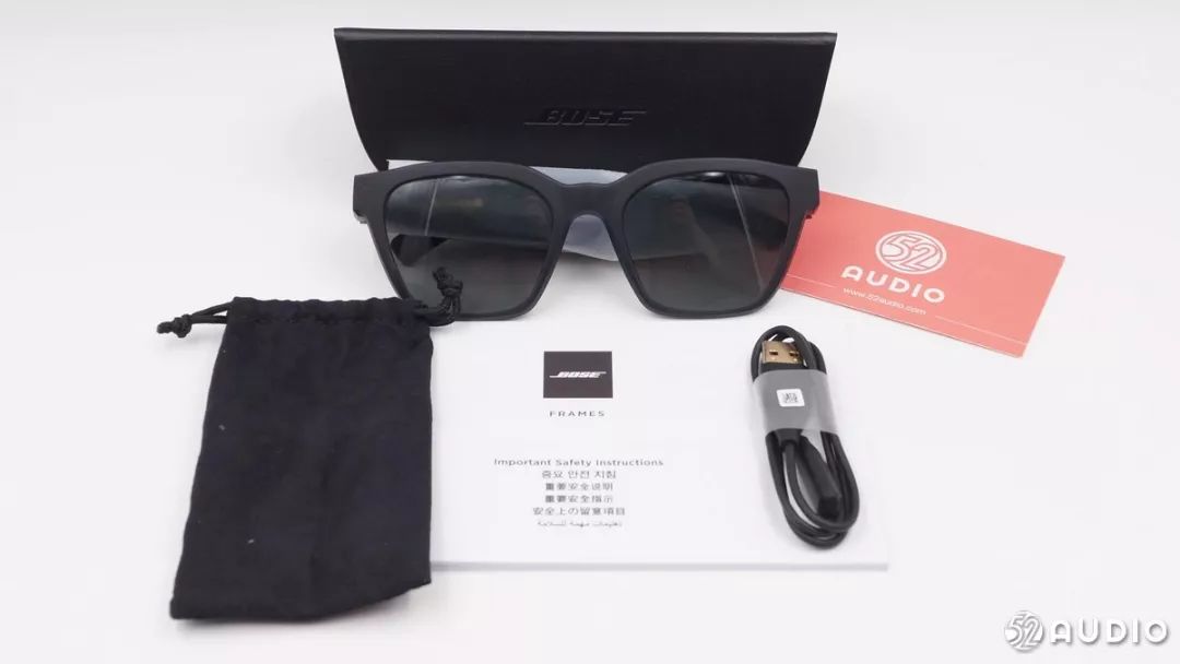 包装的产品清单:Bose智能音频眼镜,微纤维袋,眼镜盒,充电线。