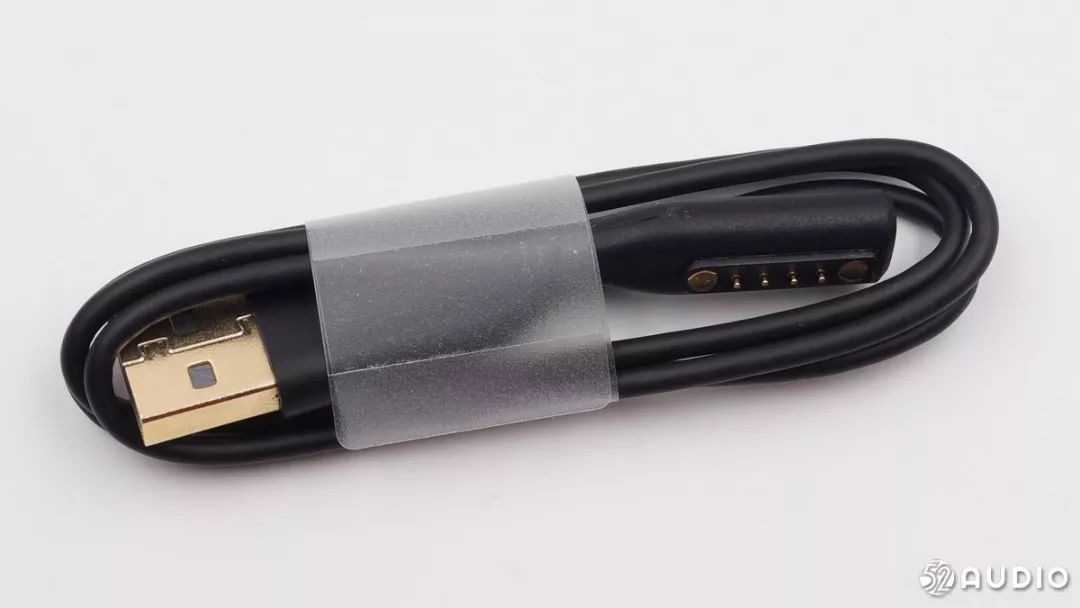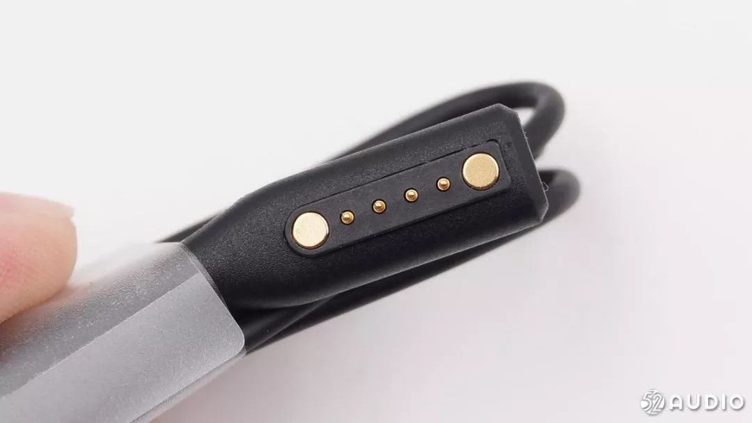 充电线一端的磁吸式充电区域,中部有四个充电顶针两侧圆点为磁吸触点。