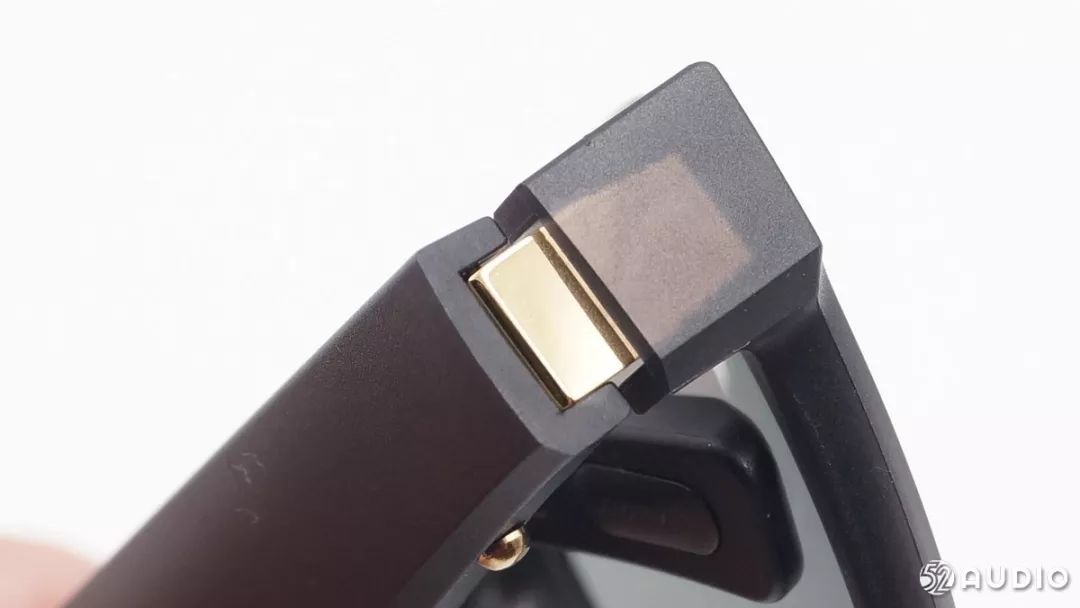 将眼镜展开,可以看见用于充电的金属触点和用于磁吸的金属触点。