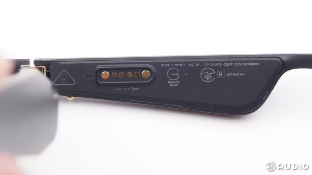 眼镜右侧支架内部特写,从左往右为麦克风开孔(两个),充电触点与磁吸触点,工作指示灯;电源输入:5V dc—70mA。
