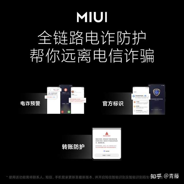 早在今年一月,小米就发布了 MIUI 13,新增系统级全链路反诈,贯穿电信诈骗整条链路,提供「电诈预警」「官方标识」「诈骗应用安装拦截」「转账防护」多重守护。