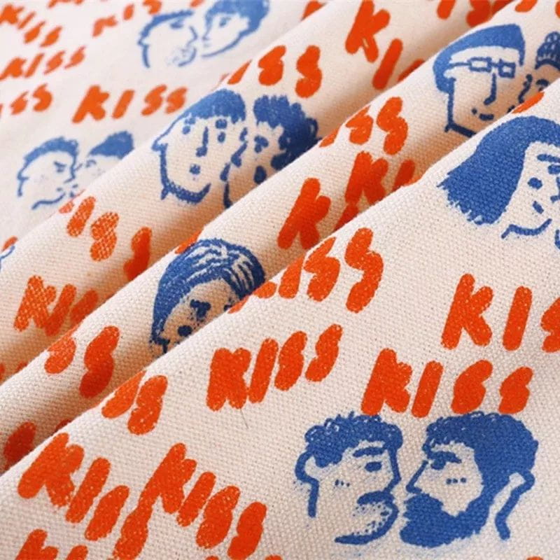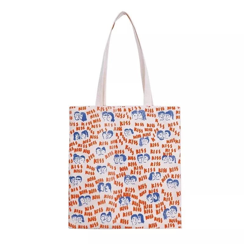 我所拥有的帆布袋数量并没有认真统计过,太多太杂了,这篇只挑几个我常背常用的。帆布袋大多两个来源,网购和旅游纪念品。各种性别各种面孔,kiss kiss kiss,这个包包几乎逢人就被问,从图案到意义,都有人爱,来自HOWL某一期情人节设计(刚刚看了已经下架sry)。